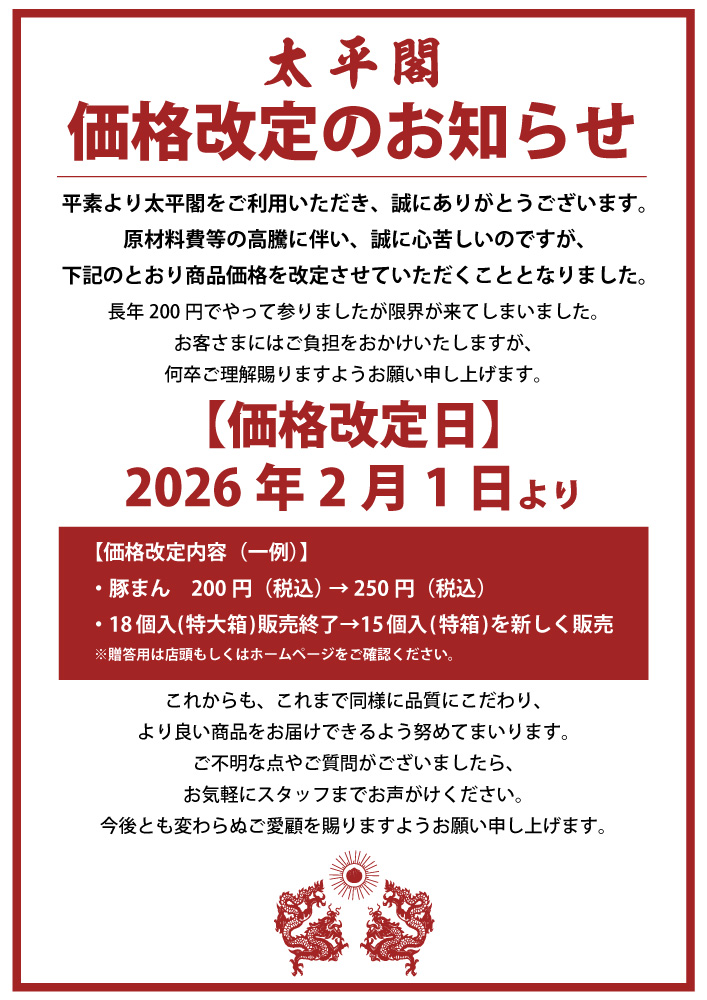 誠に心苦しいお願いではございますが、原材料費等の高騰により、2026年2月1日より一部商品の価格を改定いたします。